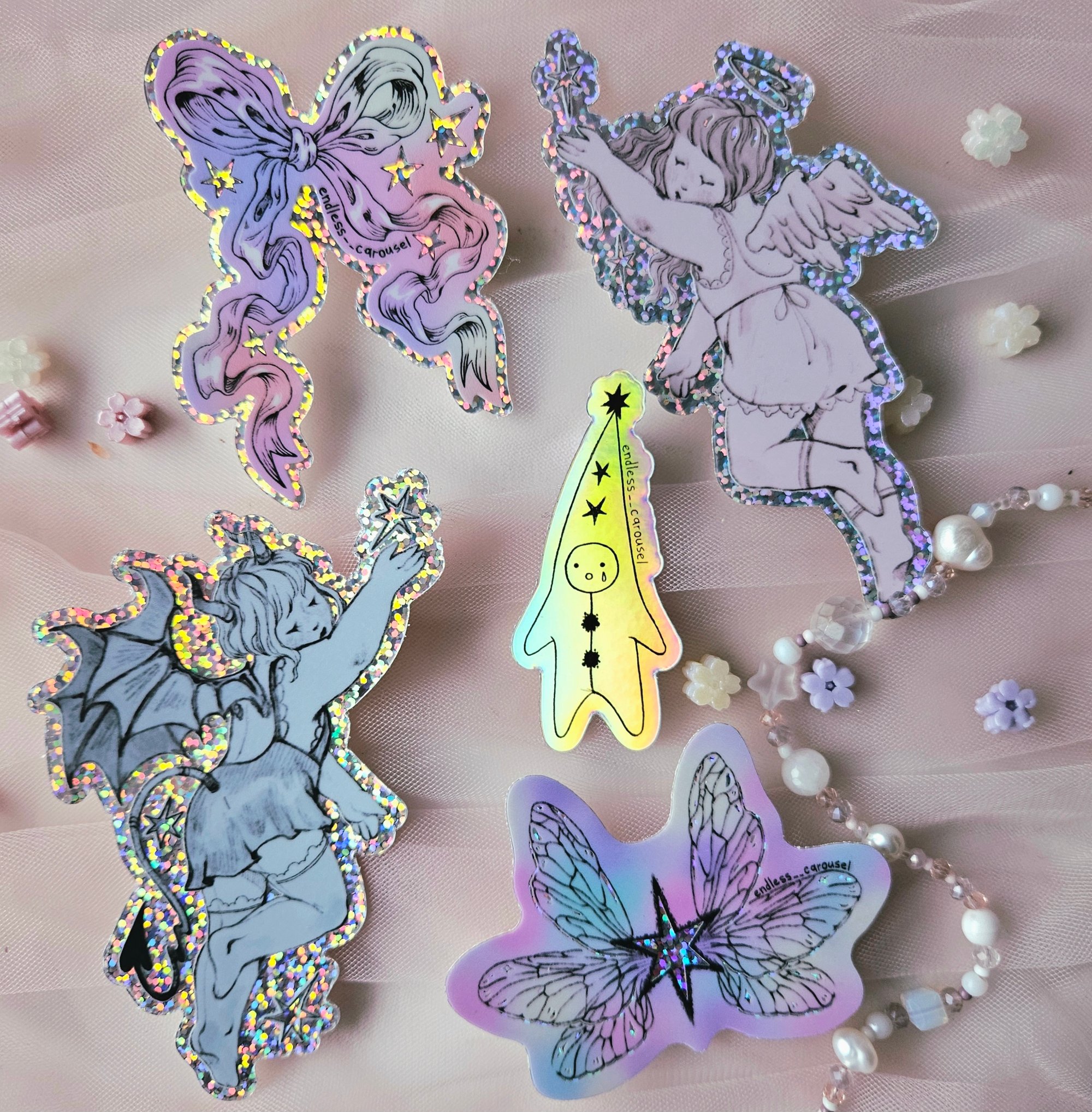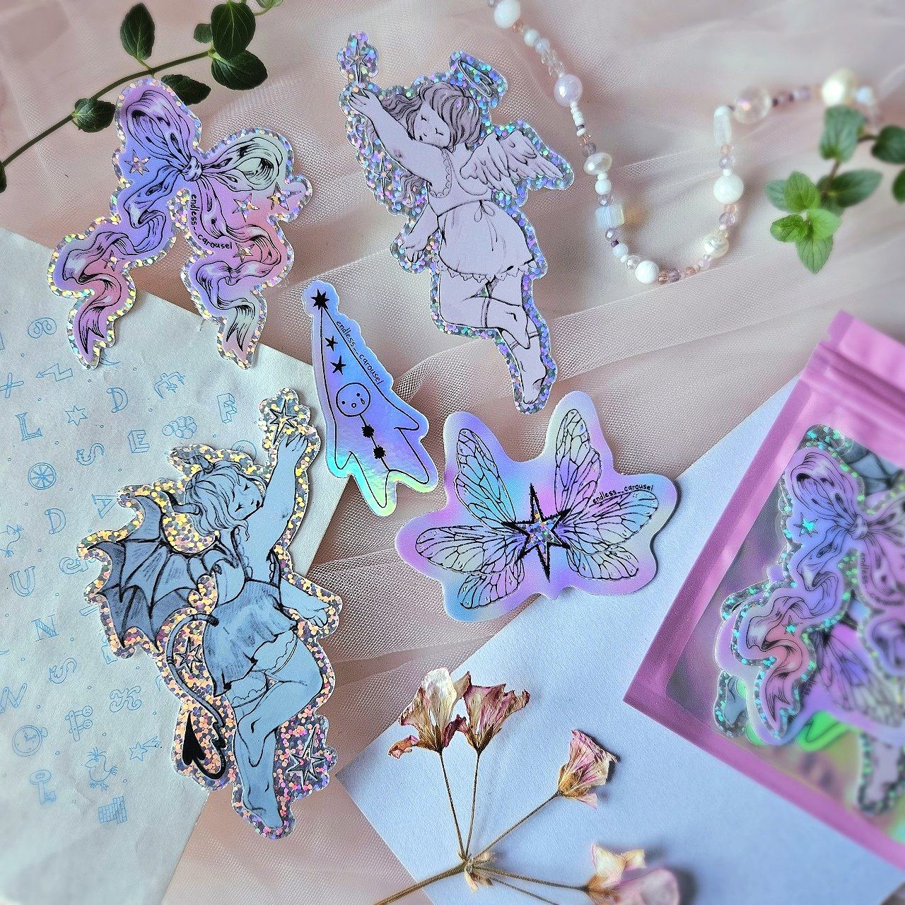 3- inch bow and winged star stickers, 4- inch devil and angel girls, 2.5 inch small holo clown